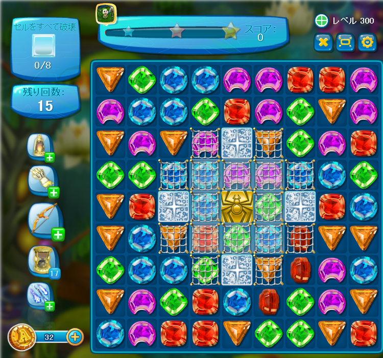 ちなみにステージ300のゲーム画面は次の通り。 上下左右の宝石を前後左右に入れ替え、同じ色の宝石を縦か横に3つ並べて消していくというパズルゲームで、ステージが進むと結構難しいです( ̄▽ ̄;) 今のところ、日常の息抜きとして、唯一プレイしているゲームですw