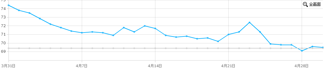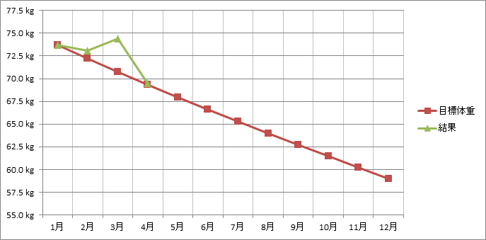 先月末からの体重の推移は、次の画像の通り。 先月末に74.4kgの体重は、今月末に69.5kgへと約5kgの減量に成功。 ・・・と、いっても、今月月初めにインフルエンザBで体重が落ち、4月下旬に今度は高熱(39.0)による風邪の影響で、不健康的にやつれた感じです(笑) 病気のおかげで、今月は、年始に目標を建てた減量計画に一気に追いついた感じです(笑) 結果オーライです! 次の目標に向けて、5月も頑張るぞーっ!