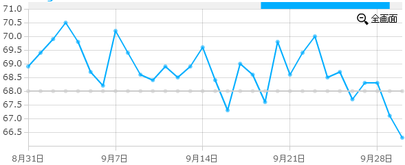8月末から9月末までの体重変化は、前回に引き続きさらにダイエットに成功!(  ̄▽ ̄)b よっしゃ!w ![]() 8月末時点で68.9kgだった体重は、波はあるものの9月末時点で66.3kgへ減りました!(  ̄▽ ̄)ノ ちなみに前回から続けた方法は、サウナとサイクリングとトレーニング器具とプロテインダイエットと青汁(笑) 相変わらずというか急激に体重が増えたりしているのは、飲み会と外食による影響です(笑) 9月下旬のシルバーウィークに入ってからは飲み会がないのと、9月末に健康診断があるため気を引き締め直して一気に落としました。 プロテインダイエットのイチゴミルク味の底が尽きたため、たまたまアマゾンで商品を探したらいつも2,000円ぐらいで買ってる薬局よりも安く送料込み1,500円ぐらいで売ってたため、今回はアマゾンにて購入です。 ![]() こういうのを見ると、自分への励みにもなり、継続したくなります!(  ̄▽ ̄)b ちなみに今も順調に体重が落ち続けてます。 最初に買ったプロテインダイエット(ミルクココア味)の底が尽きたため、ちょうど味にも飽きてきたところも重なったので、今度はイチゴミルク味を購入してみました(  ̄▽ ̄)/ ![]() ちなみにプロテインダイエットの効果は不明。(色々平行してダイエット策を試みてるので。笑) けれど、すぐに効果が出るものではないことを実感してます。 7月末から8月末までの体重変化は、ようやく成功減少へ!(  ̄▽ ̄)b よし! ![]() サウナやらサイクリングやらトレーニング器具やらプロテインダイエットやら痩せる石鹸やら青汁やら・・・試せることを色々試し始めたら減ったといった感じでしょうか。(笑) この中で、もっとも効果的に体重が減ったと実感したのはサウナとサイクリングでした。(グラフの8月下旬の体重の下がりっぷりより) |