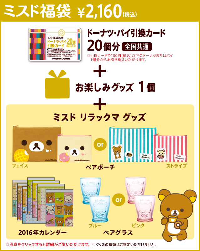 今年もローソンの秋のリラックマフェアにて、まずは「みそ汁おわん」をゲットしました!(  ̄▽ ̄)ノ ![]() 次は、おかず皿をゲットしたいところです。 毎年恒例のミスド福袋が始まりました。(  ̄▽ ̄)ノ 今回のお楽しみグッズ一個はナンジャラホイホイ♪(  ̄▽ ̄)ノ 10月27日(火)からミスタードーナツにて45周年記念スペシャルセットとして、先着順でリラックマ ワッフルケットが1,080円にて販売開始されました。 ローソンの秋のリラックマフェアでガラスボウルのためにコツコツとシール貯め続け、前回シールを40枚集めてガラスボウルと交換しましたが、さらに40枚集めてガラスボウル2つ目をゲットしました。(  ̄▽ ̄)ノ ![]() まだ期間があるので、3つ目を目指すかどうか少し考え中です。(笑) |